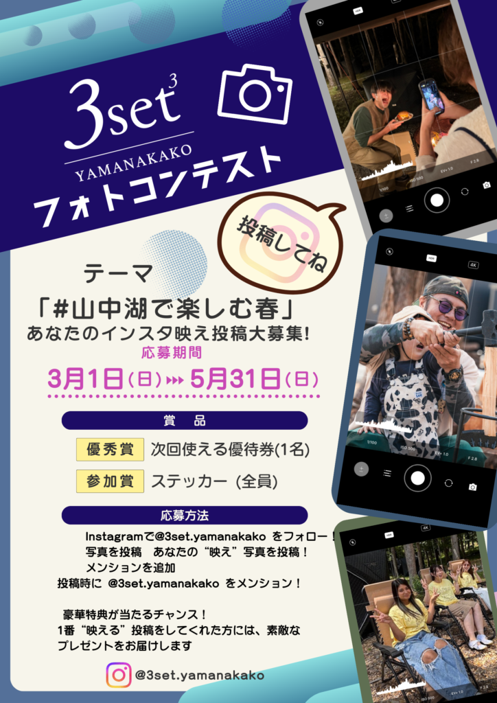 それが、「3set 山中湖 フォトコンテスト」! 春の山中湖の風景や、春休みを楽しむあなたのとっておきの瞬間を写真に収めて、ぜひご応募ください。素敵な賞品をご用意しています!